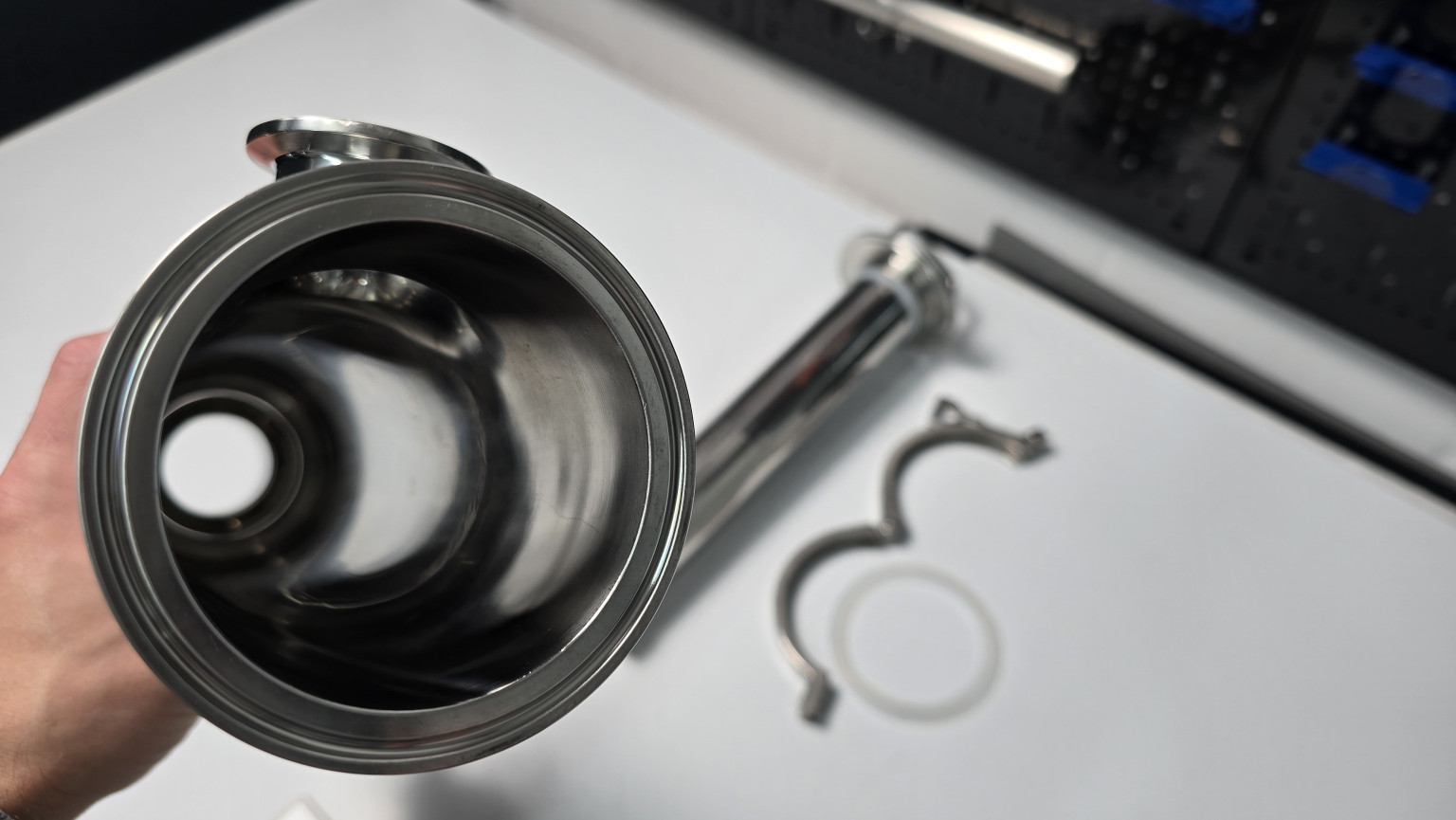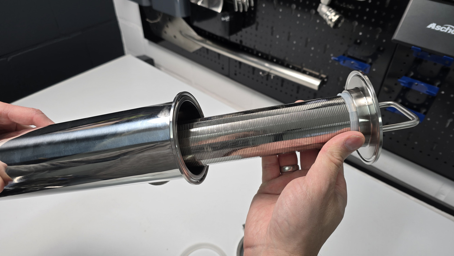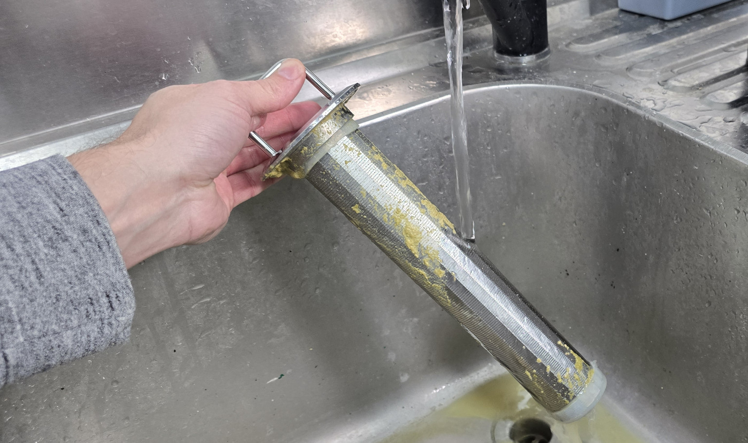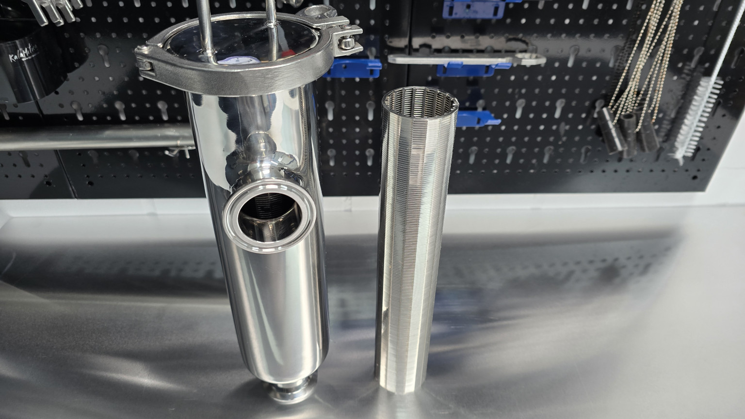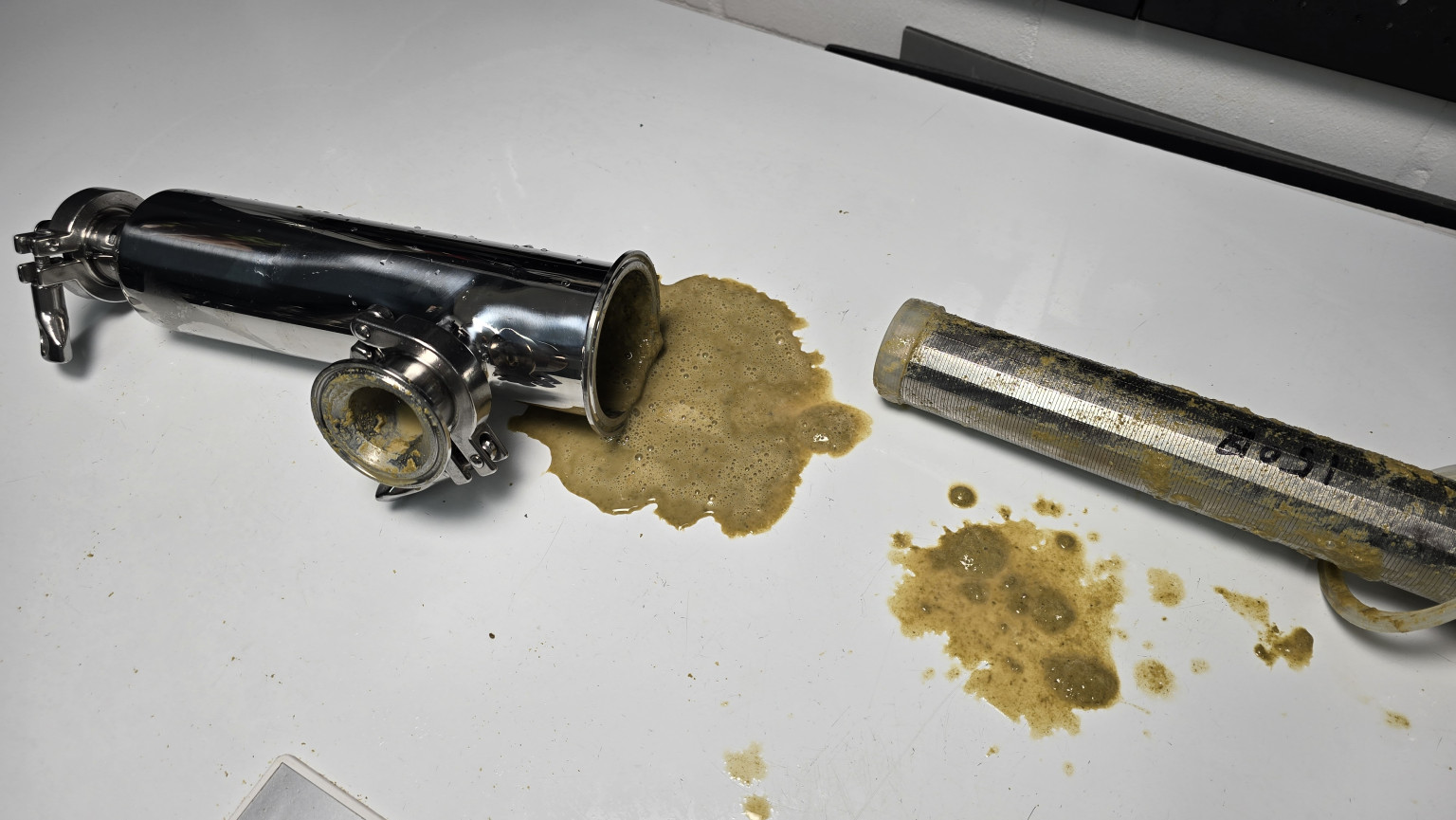 Der Reinigungsaufwand war extrem einfach. Du baust die Tri-Clamp-Verbindungen ab (stell einen Eimer drunter, es läuft immer etwas zurück), öffnest den Filter mit einem weiteren Tri-Clamp, ziehst das Spaltsieb raus und spülst es unter laufendem Wasser am Wasserhahn aus.