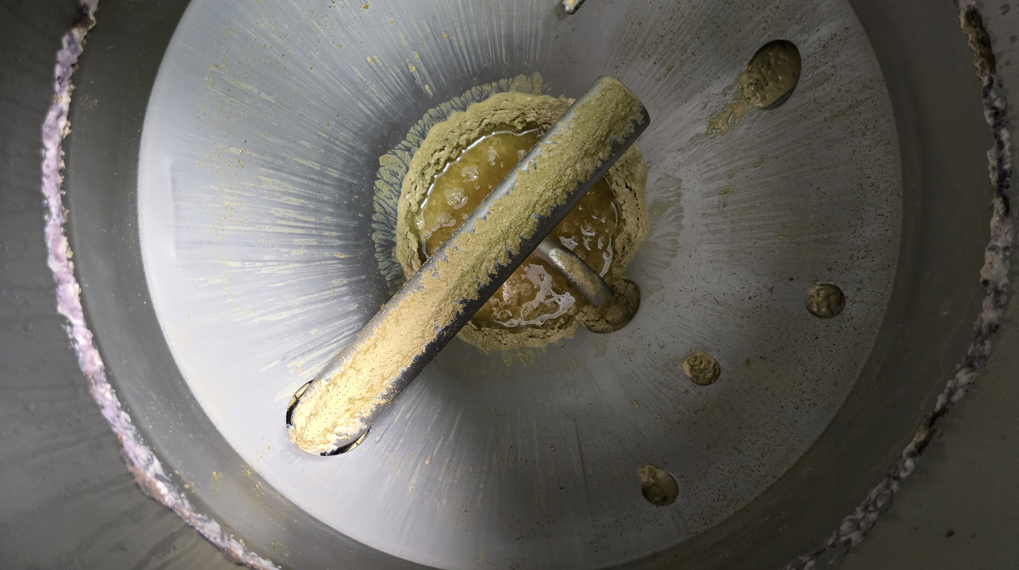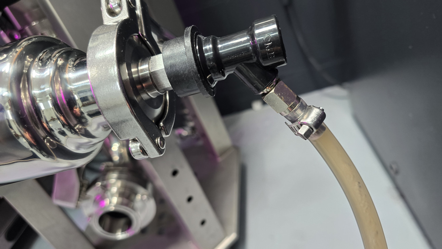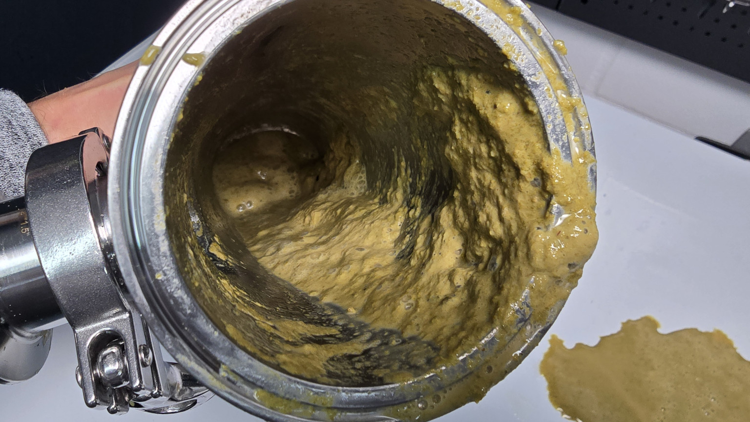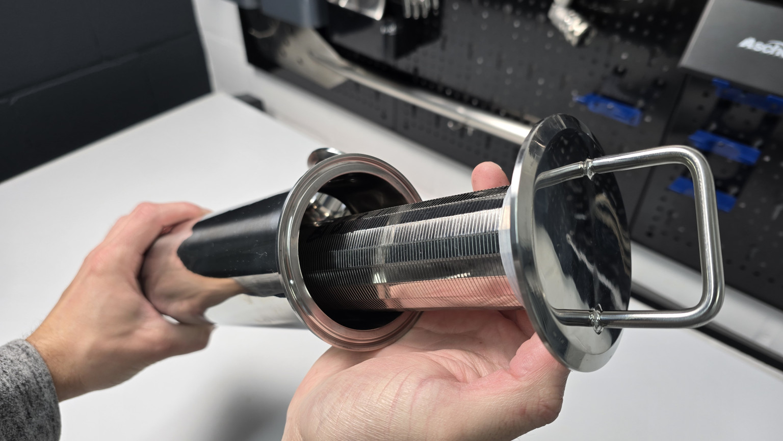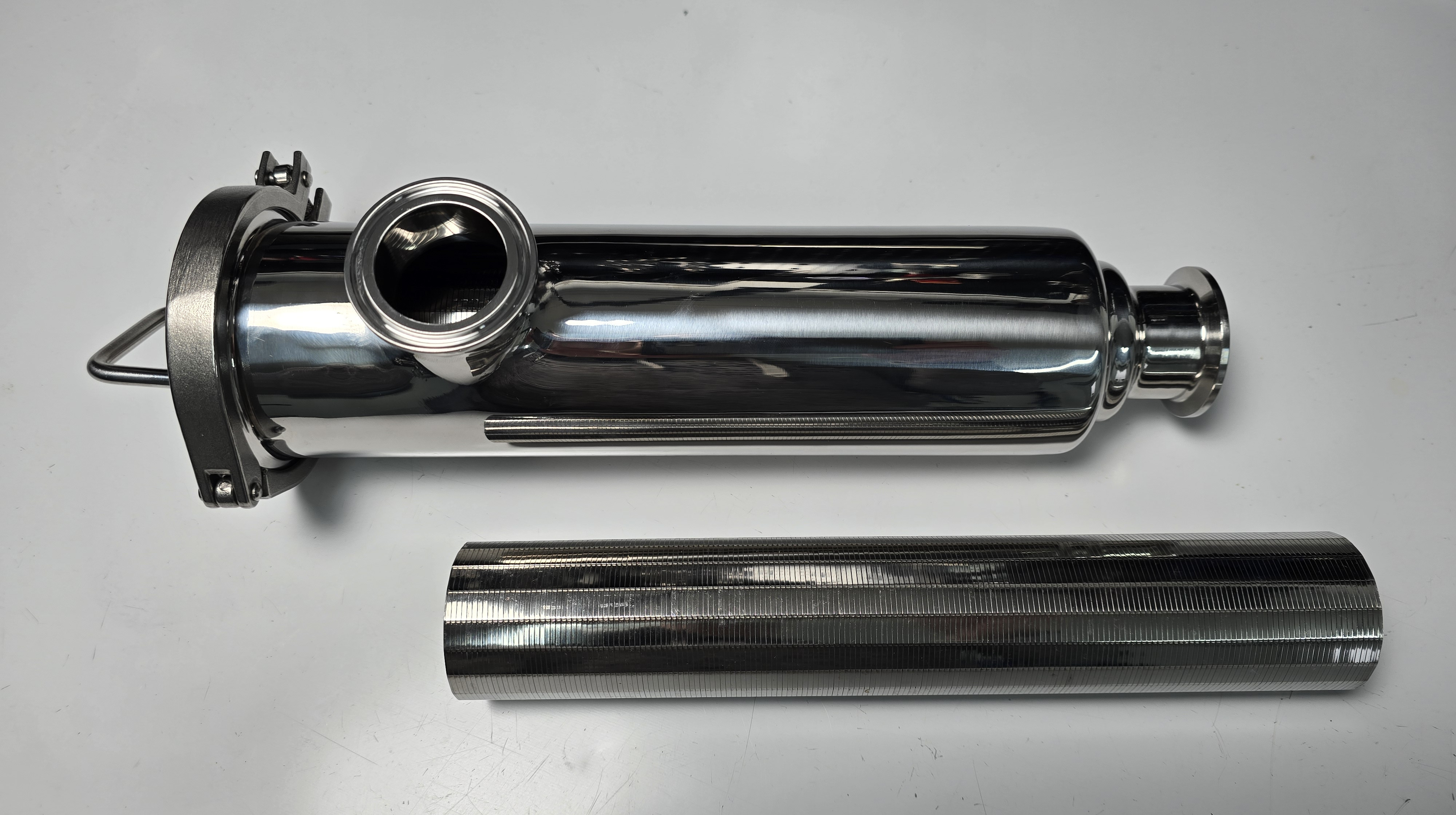 Der Reinigungsaufwand war extrem einfach. Du baust die Tri-Clamp-Verbindungen ab (stell einen Eimer drunter, es läuft immer etwas zurück), öffnest den Filter mit einem weiteren Tri-Clamp, ziehst das Spaltsieb raus und spülst es unter laufendem Wasser am Wasserhahn aus.