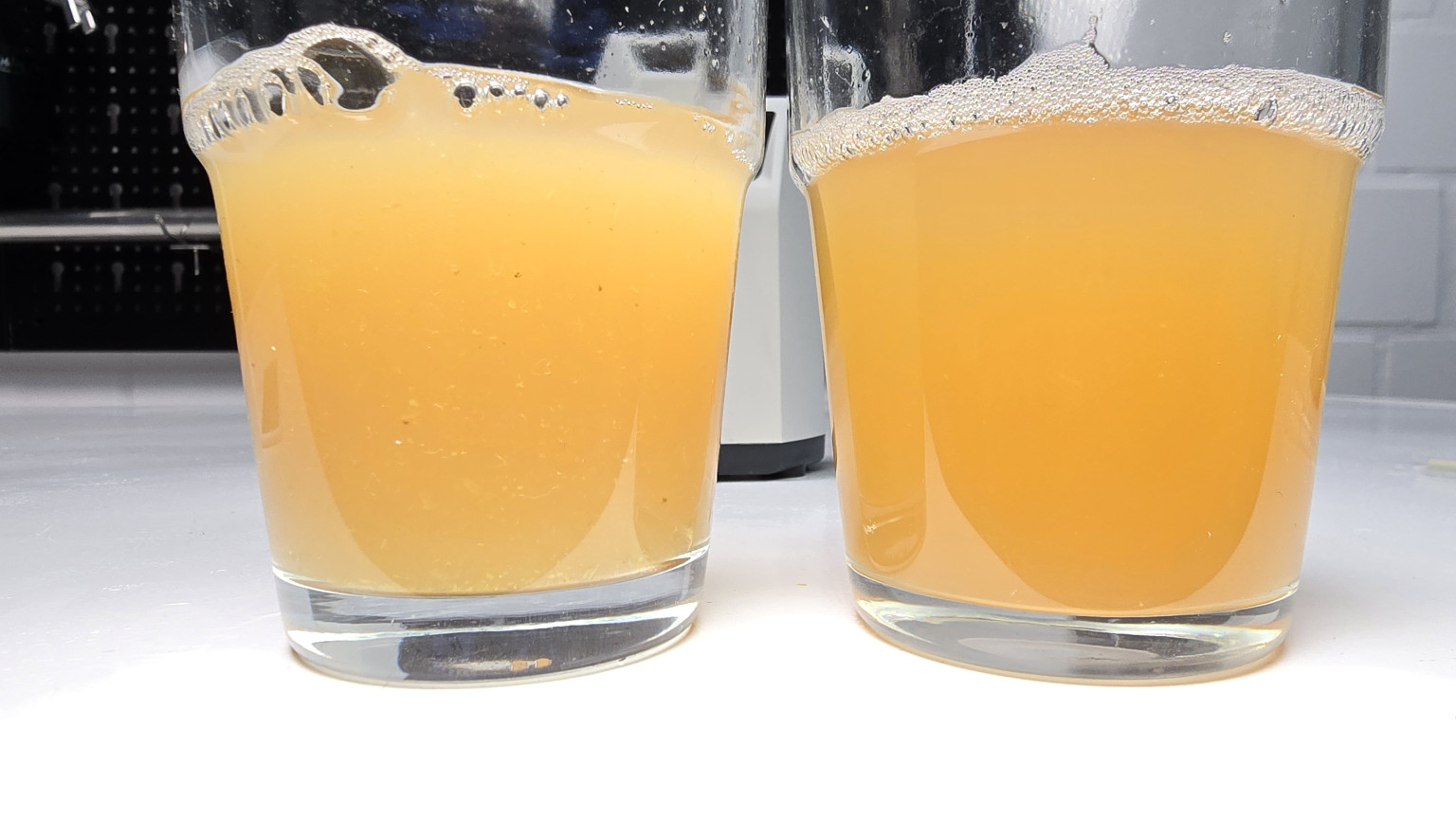 Die Probe vor dem Filter war voll mit grünen Partikeln, Hopfenresten, Trub. Die Probe nach dem Filter war zwar nicht kristallklar (das ist bei Jungbier auch nicht zu erwarten bei einem Grobfilter), aber es waren keine großen grünen Stücke mehr drin. Der Filter hat seine Arbeit gemacht.