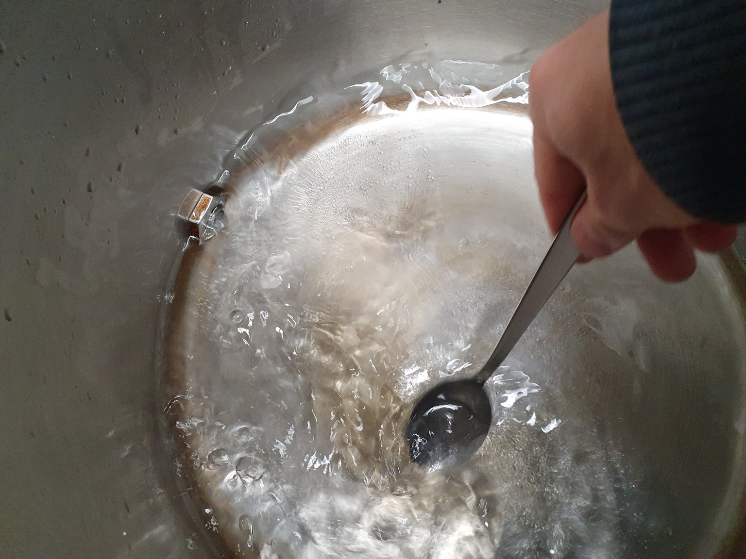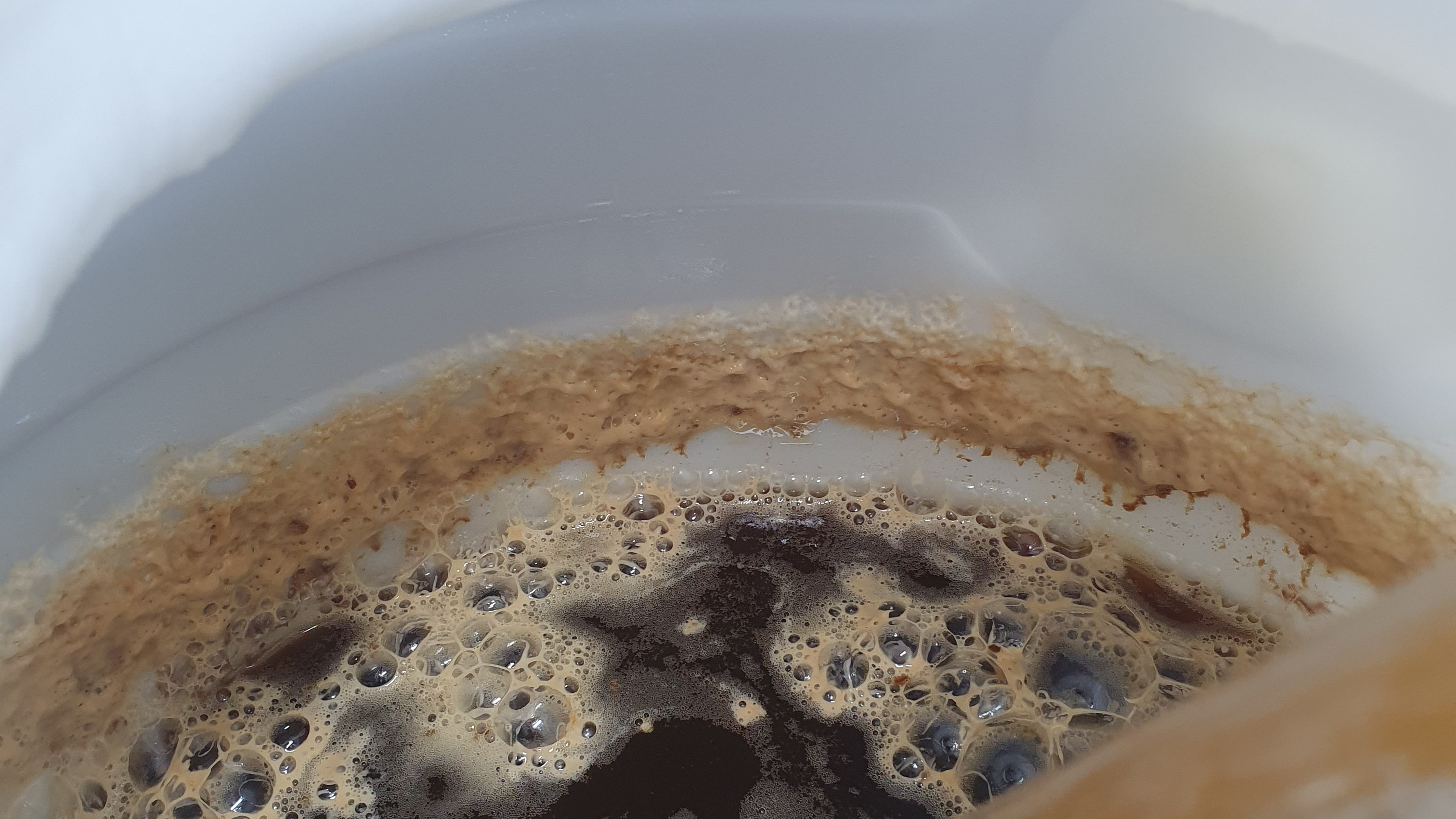 Groben Schmutz und Hefereste mit heißem Wasser ausspülen. Einfach durchspülen, bis das meiste raus ist.