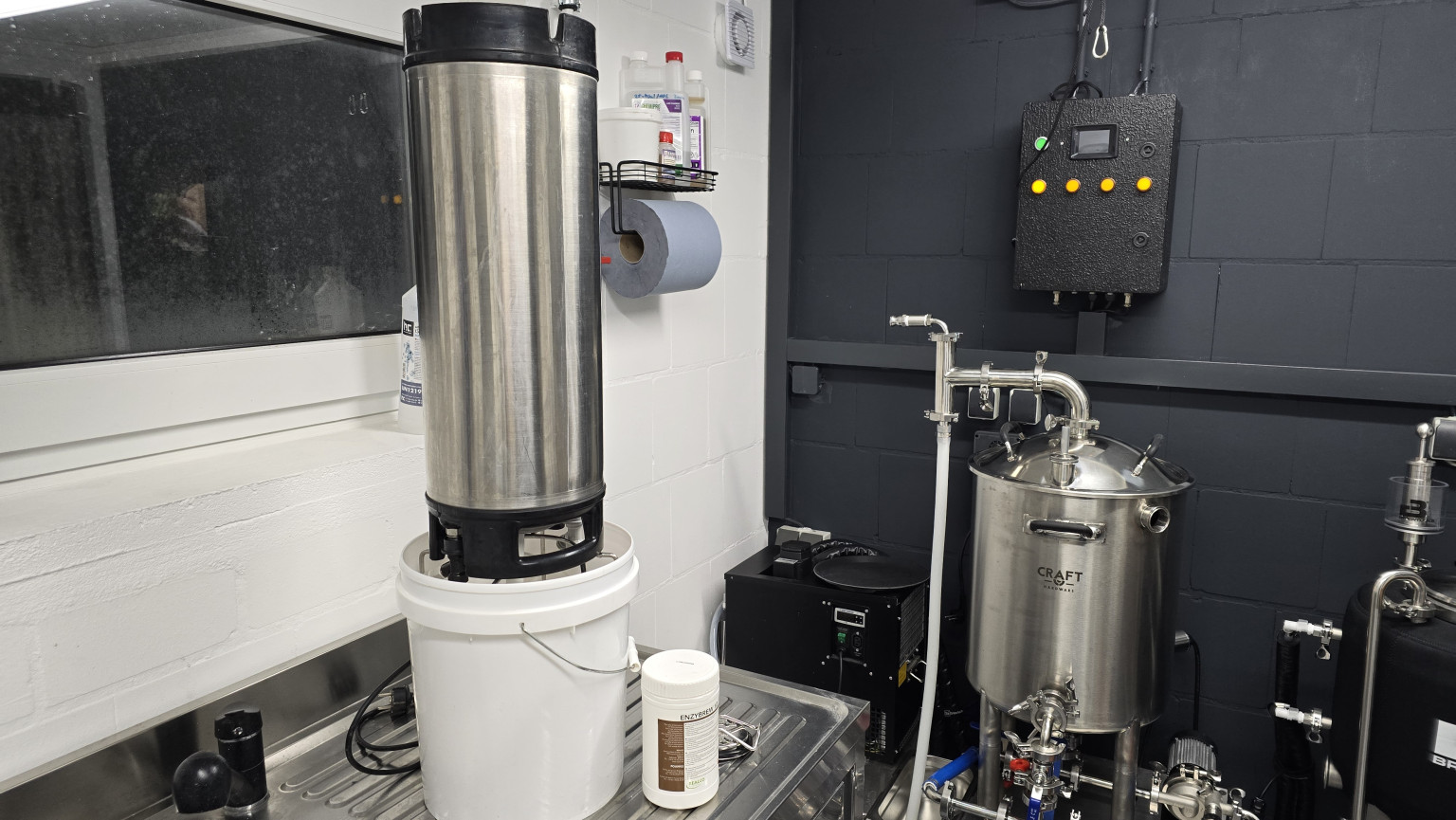 Wenn es Winter ist, würde ich nicht 55 Grad warmes Wasser reinkippen, sondern eher 65 Grad. Dann den Kegwasher starten, das Wasser kühlt sich ab, und dann erst Enzybrew 10 reingeben. Während der 60 Minuten Reinigung sollte die Temperatur mindestens in diesem Bereich bleiben.