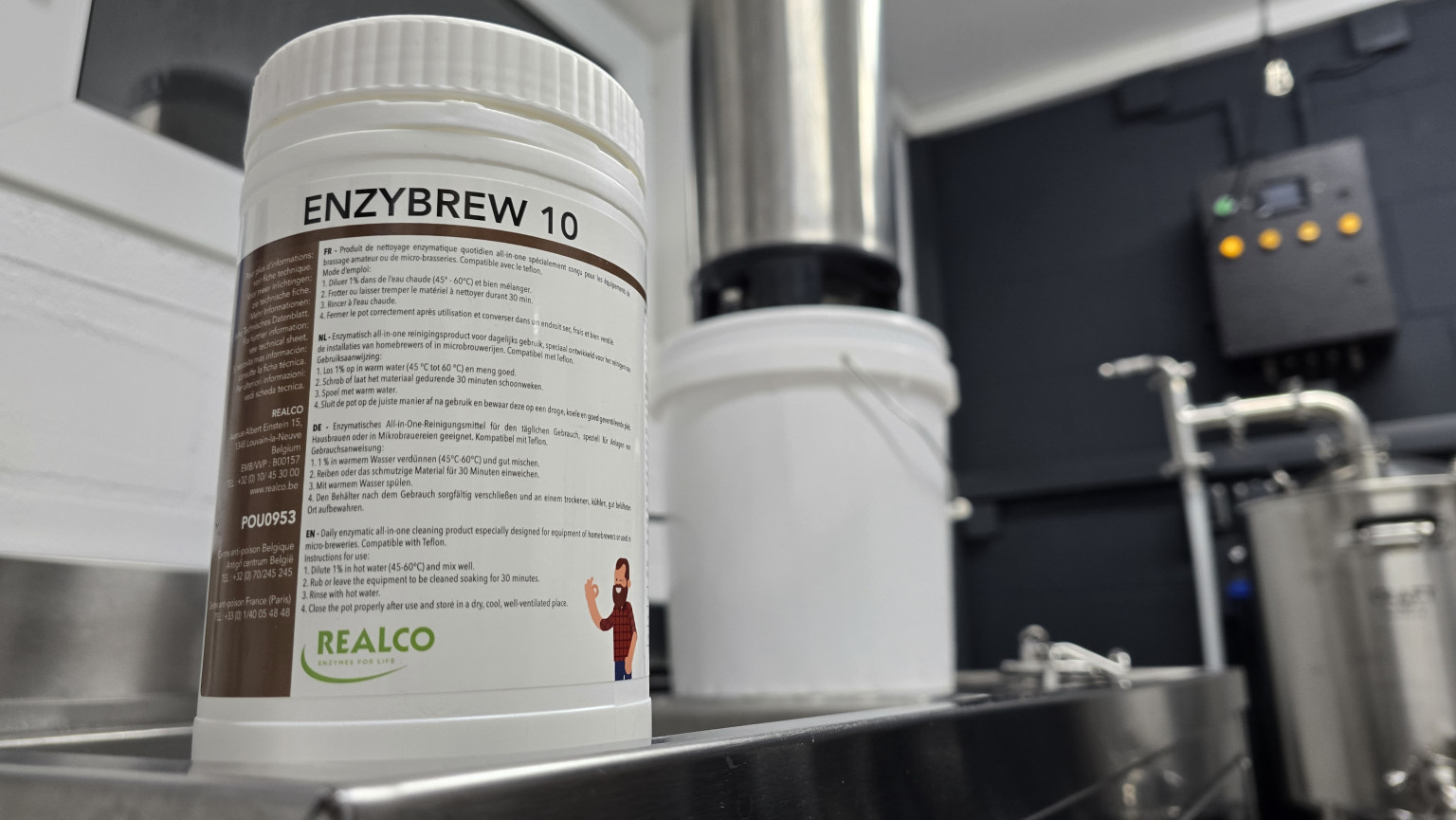 Bei groben Verschmutzungen oder wenn du auf Nummer sicher gehen willst, brauchst du einen enzymatischen Reiniger. Ich nutze Enzybrew 10 (*). Es hat eine ähnliche Reinigungsleistung wie Bevi Liquid (*) aus der Brauerei-Szene, ist aber deutlich angenehmer in der Handhabung für Hobbybrauer.