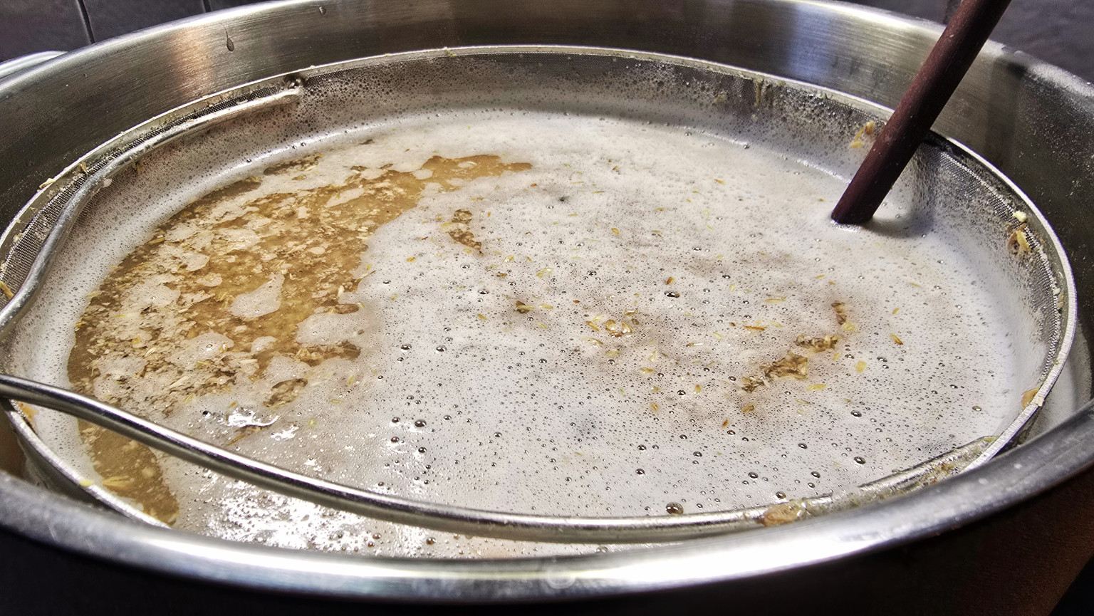Am Ende, nach dem Kochen, stelle ich den Topf einfach in ein Wasserbad mit Eis. Nach zwei Stunden ist die Würze auf 20 Grad. Währenddessen sedimentiert alles und ich kann die Würze über den Rand und ohne Trub in den Gäreimer gießen.