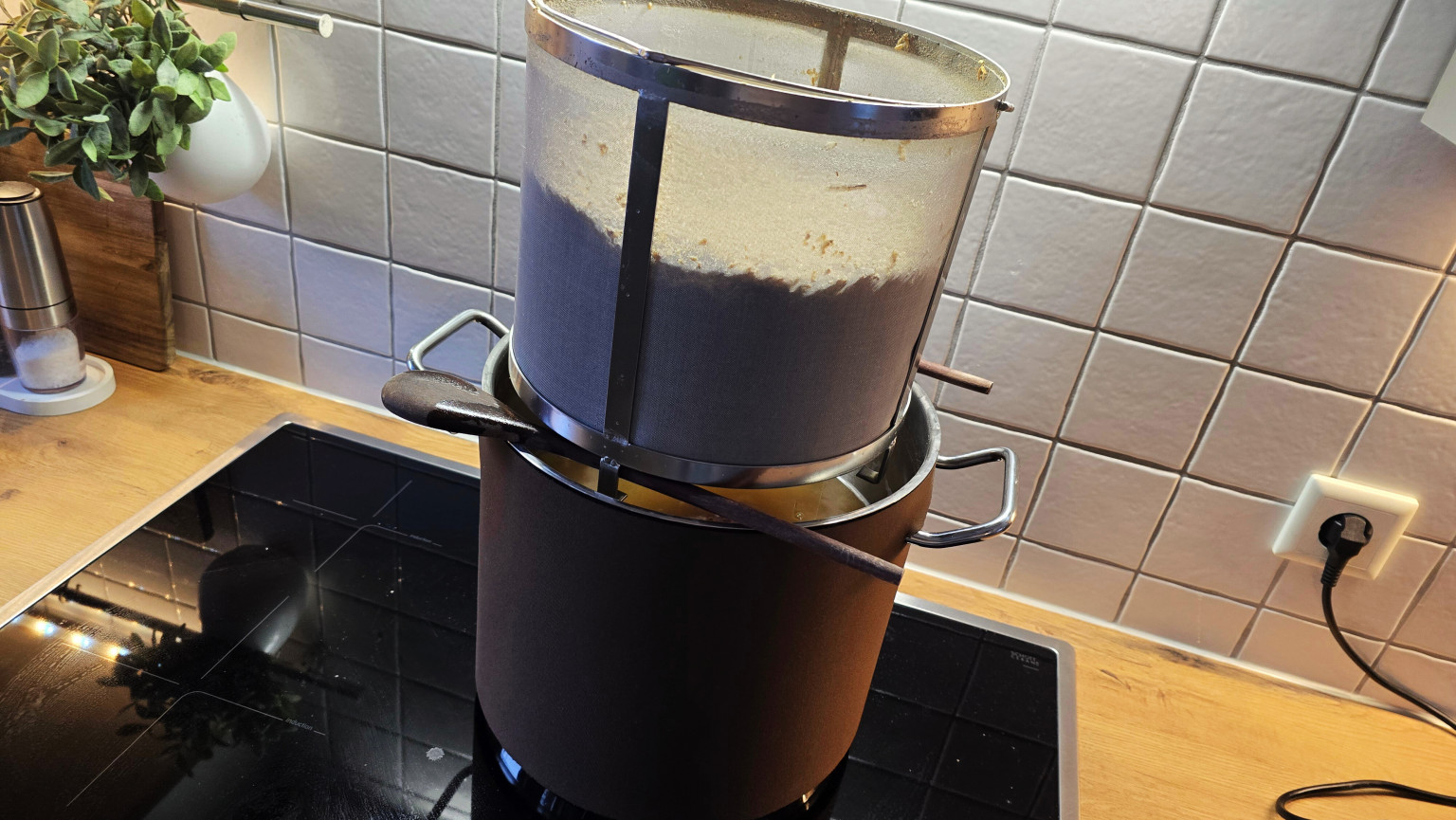 Das Setup ist minimalistisch: Ein professioneller Gastro-Topf, ein Neoprenmantel für die Isolierung, ein Korb mit 300 Mikron Mesh, eine Aufhängung und ein Holzlöffel. Das war es. Kein Hahn, keine Pumpe, keine komplexe Technik.