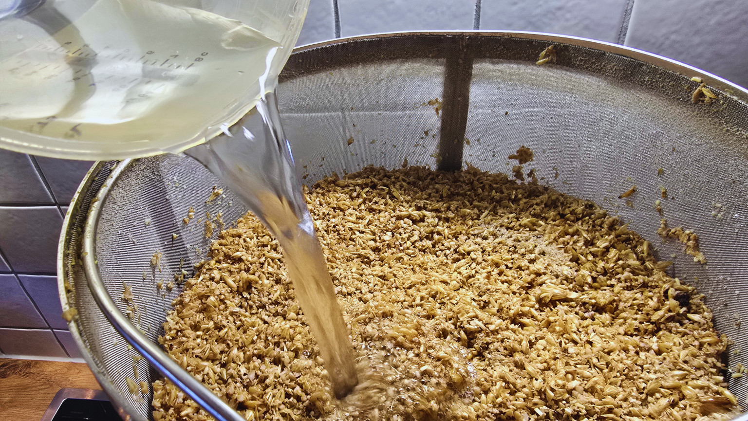 Nach dem Maischen wird der Topf hochgezogen, in eine Halterung gehängt und dann mit etwas Nachgusswasser (aus dem Wasserkocher) übergossen.